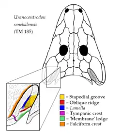 The outer wall of the cavity has a long and pronounced groove, known as a stapedial groove, which extends lengthwise along the wall. The lower edge of the groove is formed by a ridge/crest known as an oblique ridge, although it has also been called a crista obliqua, otic flange, or simply an oblique crest. The upper edge of the stapedial groove is formed by another ridge/crest bordering the squamosal bone, which Eltink et al. (2016) named the 'dorsal pterygoid crest'.[3] However, Mariscano et al. (2017) preferred to use the name "lamella" for this structure so that it would not be confused with a different ridge present in lydekkerinids, which is sometimes termed an 'oblique crest of the pterygoid', but more commonly called a 'tympanic crest'.[1][3] Confusingly enough, many rhinesuchids are also known to possess a tympanic crest. This ridge was positioned further back than the other ridges (near the intersection of the pterygoid, quadrate, and squamosal bones) and extends down along the rear face of the cheek. The inner edge of the outer wall of the cavity was formed by a ledge which most studies simply label 'membrane'. This convention exists as a result of the old and likely incorrect hypothesis that otic notches housed eardrums.[4] Under this hypothesis, the inner ledge may have attached to a membrane stretching along the inner cavity of the ear.[3]