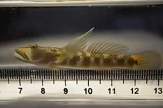 The Rhinogobius brunneus complex contains many color morphs. These color morphs are considered genetically different from each other and also show differences in microhabitat preference and egg size.[5][6] Up to eight morphs have been described, most commonly: cross-band, dark, mosaic, and large-dark.[5][7] The cross-band type is characterized by obvious cross-bands on the side of the body, a wavy vertical band on the caudal peduncle, a thick blue band running longitudinally across the belly, vertical bands on the pectoral fin, and small spots on the fins. The large-dark color morph can be identified by no markings on the cheek, a dark triangular blotch on the caudal peduncle, a diamond-shaped blotch on the pectoral fins, and white fringing on the fins.[7] The taxonomy for this species complex is not resolved.