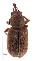 Rufous, moderately shining, pilose, antennae and legs fulvous. Antenna inserted at the middle of the rostrum, moderately stout, eight-jointed, club three-jointed; the two basal joints are of nearly equal length, and, together, nearly half as long as the rest conjointly; third and fourth elongate, each a little shorter than the fifth; sixth to eighth about equal; the club is loosely articulated, its basal joint somewhat cup-shaped, second largest, sub-quadrate, apical. Rostrum rather slender, elongate, somewhat deflexed and arcuated, proceeding from the lower part of the head; its basal half is narrow and cylindrical, a little incrassated near the eyes, the apical half is abruptly (but not greatly) dilated; mandibles prominent; it is of a shining rufous colour, and quite nude. Head punctate, nearly as broad as the thorax, short, deflexed in front; eyes moderately large and prominent, nearly circular. Thorax oviform, longer than broad, the sides regularly rounded, base sub-truncate, disc finely punctured. Elytra oblong, wider than the thorax, somewhat emarginated at the base, shoulders obtuse, the sides nearly parallel and rounded apically; the disc, owing to slight basal and posterior elevations, exhibits a subdepressed aspect; they are punctate but not perceptibly striated. The legs are moderately long, the femora inflated, tibise straight, not spined; tarsi stout, basal joint obconical, more slender but rather longer than the second, which is triangular, the penultimate is bilobed, the apical elongate. Scutellum small, somewhat transverse. The body is clothed with sub-depressed stiff fulvous hairs, the legs and antennae nearly nude. The fifth joint of the antennae is obconical and stouter than the others.[4]