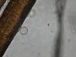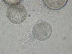 | A member of Rhizophydiales growing on nutrient agar. Note the discharge papillae near the 12 o'clock position. | |