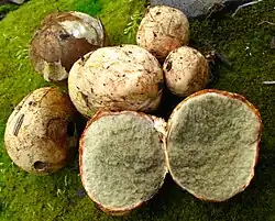 Rhizopogon evadens is a truffle-like fungus in the family Rhizopogonaceae. Found in North America, it was described as new to science by American mycologist Alexander H. Smith in 1966.[2] The fungus produces roundish to irregularly shaped fruitbodies measuring 2–5 cm (0.8–2.0 in) in diameter, with irregular lobes, wrinkles and depressions on the surface.[3] The peridium (outer tissue layer of the fruitbody) is whitish with light yellow to brown stains, and bruises red. The fungus has an unpleasant odor and a taste described as "metallic". Typical tree associates include pine, Douglas fir, and hemlock.[4] Initially white, the gleba (the interior contents) turn olive to olive-brown in maturity, with the contents developing a gelatinous consistency.[3] The smooth spores of R. evadens are narrowly ellipsoid in shape, and measure 6–8 by 2–2.3 μm.[4]
