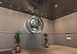 Its first floor was designed with a five-story galleria-like lobby, a unique feature made possible by the building's elevator placement. The center of the lobby has a winding staircase leading up to the former Supreme Court level as well as two escalators that lead to the basement's restaurant and passage to the Statehouse garage.[17][11] Towards the back of the lobby is a stainless steel recreation of the Great Seal of Ohio.[11] The floorplans of the building are column-free, 144 feet square. All of the building's elevators (20 for passengers and two for freight[11]) and service shafts were designed outside of the square office space, at the north and east (back and side of the building).[10][17] The elevators include express elevators that skip floors between the lobby and 18th floor. One of these elevators malfunctioned in 2021 with no injuries.[29]
