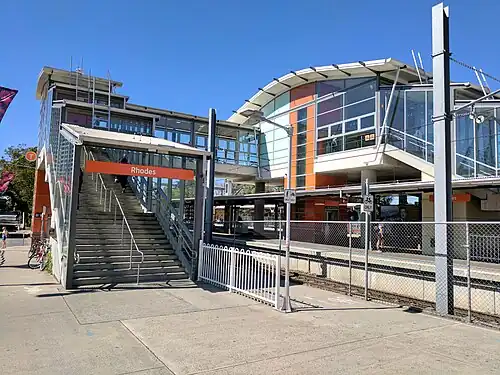 Rhodes railway station is a heritage-listed suburban railway station located on the Main North line, serving the Sydney suburb of Rhodes. It is served by Sydney Trains T9 Northern Line services.