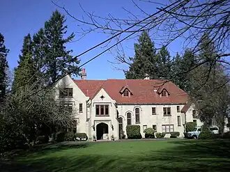 The 12,600-square-foot (1,170 m2) 1921 house with its 8+ bedrooms and 7+ bathrooms was on sale in 2009 for $3.4 million.[2] Its carriage house (built later in 1941) at 10914 Greendale was also up for sale.[3] It is located on Lake Steilacoom. According to the broker's website, it was built in memory of Edward Rhodes, "who served and paid the ultimate sacrifice in World War I".[2]