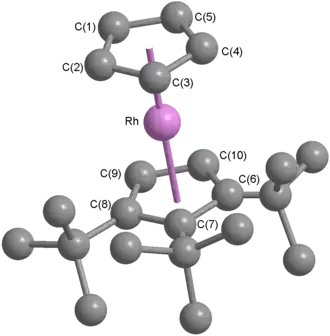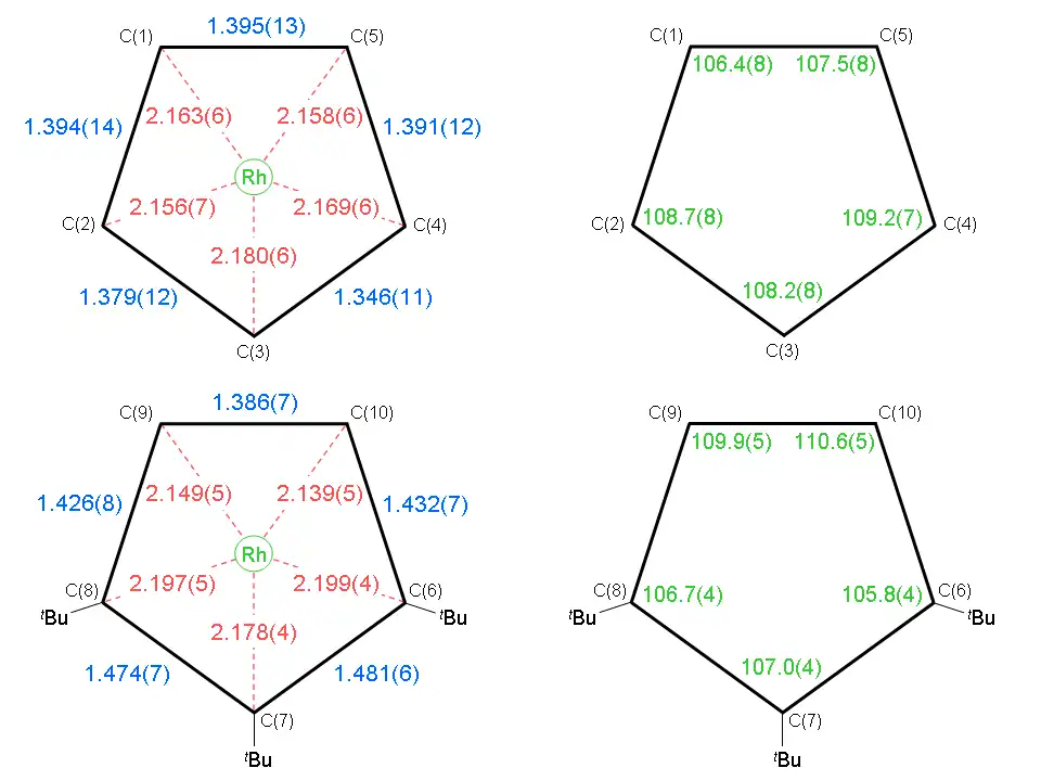The diagram above shows the rhodium–carbon (in red, inside pentagons on the left) and carbon–carbon (in blue, outside pentagons on the left) bond distances for both ligands, along with the bond angles (in green, inside pentagons on the right) within each cyclopentadienyl ring. The atom labels used are the same as those shown in the crystal structure above. Within the unsubstituted cyclopentadienyl ligand, the carbon–carbon bond lengths vary between 1.35 Å and 1.40 Å and the internal bond angles vary between 107° and 109°. For comparison, the internal angle at each vertex of a regular pentagon is 108°. The rhodium–carbon bond lengths vary between 2.16 Å and 2.18 Å.[44] These results are consistent with η5-coordination of the ligand to the metal centre. In the case of the substituted cyclopentadienyl ligand, there is somewhat greater variation: carbon–carbon bond lengths vary between 1.39 Å and 1.48 Å, the internal bond angles vary between 106° and 111°, and the rhodium–carbon bond lengths vary between 2.14 Å and 2.20 Å. The greater variation in the substituted ligand is attributed to the distortions necessary to relieve the steric strain imposed by neighbouring tert-butyl substituents; despite these variations, the data demonstrate that the substituted cyclopentadienyl is also η5-coordinated.[44]