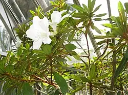 Rhododendron boninense is an evergreen shrub that grows to a height of 2–3 metres (6 ft 7 in – 9 ft 10 in).[3][4] Its white flowers bloom in and around April.[4][5]