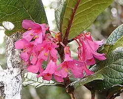 Rhododendron rugosum is a shrub or small tree which grows up to 8 metres in height. It grows as an epiphyte or as a terrestrial plant.