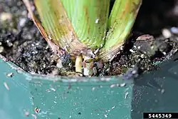 Adults and nymphs externally feed on the roots and occasionally the stem, passively consuming the phloem, causing vigor loss. The feeding sites' location can become discolored and leaves or stems, chlorotic or pale.[28] Plant parts may also appear desiccated and distorted or display the formation of rosettes.[4] High pest densities can cause wilting of the whole plant and result in death.[5][8] In rice, it is well documented that injury causes leaf chlorosis and stunted growth with severe infestations exhibiting wilt followed by plant death.[8] Aphids also produce honeydew; the deposits can promote mold or fungal growth known as sooty mold. Below the surface, this may resemble a light dusty halo, not dissimilar to powdery mildew spots.[9] Even outside of typical host range, serious indirect consequences among plants can occur due to their stylet's investigative probe that transfers saliva resulting in serious plant disease transmission.[29][30] This indirect injury can vector sugar cane yellow leaf virus and barley yellow dwarf virus.[29] In India, it has been reported to transmit maize mosaic virus and sugarcane mosaic virus.[5]