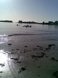 Rhoscolyn is bordered to the south by a small enclosed bay called Borthwen which is bordered by a public beach. There was once a lifeboat station on Borthwen which was open between 1830 and 1929[8] which has been replaced by a navigational beacon on Ynysoedd Gwylanod ('Gulls' Islands'). Around these waters at the end of the 18th century was a thriving oyster catching industry, but this declined once the beds had been depleted.[9] Existing buildings include the local pub, The White Eagle and the Ysgol Gynradd Santes Gwenfaen primary school which is found just over a mile north of the village.