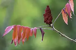 Rhus typhina, the staghorn sumac,[5] is a species of flowering plant in the family Anacardiaceae, native to eastern North America. It is primarily found in southeastern Canada, the northeastern and midwestern United States, and the Appalachian Mountains,[6] but it is widely cultivated as an ornamental throughout the temperate world. It is an invasive species in some parts of the world.