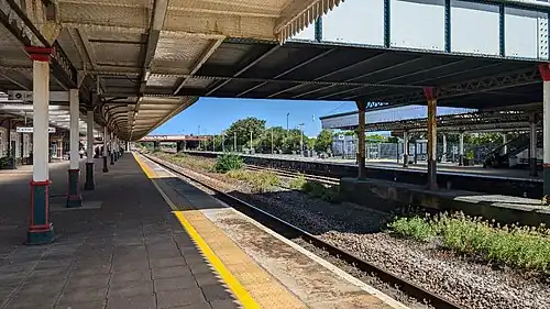 Ticket barriers are in operation at the station; the ticket office on platform 1 is staffed throughout the week. A ticket machine is also available for use and for collecting pre-paid tickets purchased online or via telephone. There are also toilets, a cafe, retail units and waiting room in the main building. Platform 2 (westbound) has a waiting shelter and canopies, but the remaining buildings there are not in rail use. The platforms are linked by a footbridge with integrated lift, so both are fully accessible for disabled passengers. Train running information is offered via digital display screens, automated announcements and timetable poster boards.[7]