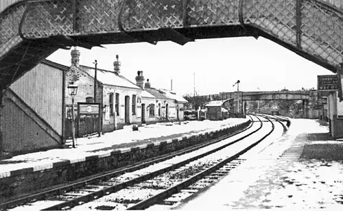 The station, which was at first known as Rumney Bridge,[6] opened to Rhymney services on 2 October 1871 and to L&NWR services on 1 January 1873.[6][7] It took its name from the bridge over the River Rhymney which was situated a short distance to the south-east; the nearest settlement was the village of Llechrhyd.[8] The station had three platform faces[9] and, as with the junction at Nantybwch, the signal box stood in the "V" of an island platform.[10] The two platforms serving the Abergavenny and Merthyr line had no passenger accommodation, although a brick station building stood on the Merthyr platform.[11] This structure has been described as "resembling a peasant's dwelling from the bleak wastes of northern China".[12] Rhymney Bridge itself was situated in a desolate location, with scant protection from the inclement weather provided by a weather-boarded footbridge linking the platforms.[13] The Rhymney branch platform was situated at a lower level to the main line platforms and was skirted by two goods loops which were useful for slow-moving goods trains.[14]
