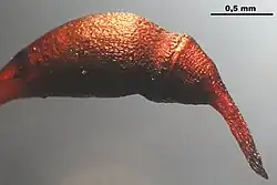 Rhynchostegium are autoicous.[3] Covered by a naked calyptra is a rostrate to long-rostrate operculum attached to a red-brown to brown, oblong-cylindric, weakly curved capsule, which is inclined or horizontal to a red-brown, smooth seta that has abruptly contracted perichaetial leaves at the base, with acumen straight to reflexed.[1][3] An annulus separates the operculum.[3] The peristome is xerochastic and perfect, which the red to orange-red exostomes have reduced trabeculae and cross-striolae at the base of the teeth; in rare cases the exostomes are narrow and yellow.[1][3] The broadly or narrowly perforated endostomes and developed to vestigial cilia are supported by a low or high basal membrane.[1] Spore diameters range between 9-16 μm.[3]