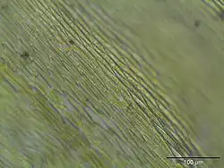 Rhynchostegium are small to large mosses that form either loose tuft or extensive mats on the substrate, with irregular or regular branching.[1][3] The younger plants are generally deep green or light green; aging plants could become whitish, brownish, or paler green.[1][3] Stems are creeping and lack hyaloderm, with acute to acuminate pseudoparaphyllia.[3] Stem leaves are erectopatent or erect.[1][3] Branch leaves are similar in morphology to stem leaves but smaller and sometimes narrower.[3] Leaves are commonly straightly to homomallously arranged; subimbricate, subcomplanate, or complanate arrangement are sometimes seen, especially in branch leaves.[1] Leaf base, decurrent or not, varies from ovate to ovate-cordate, occasionally lanceolate, and the narrowing from gradual to abrupt, towards a short- or long-acuminate apex, where sometimes a differentiated long acumen or apiculus is present.[1] The leaves have a single costa that generally smoothly ends 35-75% up the leaf, and more often in branch leaves in an abaxial spine.[1] Leaf surfaces vary from flat to slightly concave and not to strongly longitudinally plicate, with little to some pores and linear laminal cells.[1][3] Leaf margins are serrate to serrulate.[1][3] Axillary hairs constitute of 3-7 cells,[3] with 1-3 upper cells.[1] Alar cells are slightly enlarged, and either undifferentiated or quadrate to elongate-rectangular.[1][3]