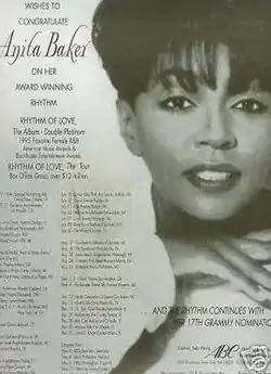The Rhythm of Love Tour was a 1994–95 concert tour by American recording artist Anita Baker in support of her multi-platinum selling album, Rhythm of Love. The trek started on December 14, in New Orleans, visiting several cities in North America and Europe, ending in late-December 1995.[1]