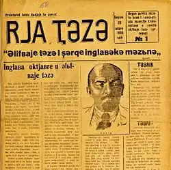 Ria Taza ('New Path', also spelled Rya Teze or Riya Teze)[a] was a Kurdish-language newspaper published in Yerevan, Armenia.[1][2] The newspaper was founded in March 1930 and the first issue was published on 25 March 1930, printed in Kurmanji Kurdish with the newly latinised alphabet of Shemo Margulov.[2][3][4] It was the organ of the Kurdish section of the Communist Party of Armenia,[1] and was produced under the auspices of the Central Committee of the Communist Party of Armenia and the Supreme Council and the Council of Ministers of the Armenian SSR. At the time, it was a four-page newspaper, published twice every week and with a circulation of 600 copies.[4] Prior to the Kurdish linguist and author Cerdoyê Genco taking over as editor in 1934, the newspaper was run by three Armenians born in Western Armenia: Kevork Paris, Hrachya Kochar and Harutyun Mkrtchyan, who knew Kurdish.[4][5] Publication was discontinued in 1937.[2]