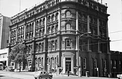 Originally built as the Wool Exchange building in 1891, the architects were Charles D’Ebro and Richard Speight Jnr.[26][27] It had a front section of offices, and a much larger rear section of stores of various sizes, stretching the full block back to Flinders Lane. The front section is an example of the Queen Anne style, in red brick with detailing in cement render including banding across the facade, double height arches, scrolled and broken pediments, a high gable and a circular corner turret. Built at the same time as the Rialto, the two corner turrets face each other across the gap formed by the laneway between them, originally called Winfield Square. The building was Melbourne's first amalgamated wool exchange and incorporated an auction hall (in the rear section) which brought together all Melbourne wool sales, until they left for a new location in 1914. Other tenants in the rear stores included the Melbourne Chilled Butter Company and Melbourne Cool Storage Co.[27]