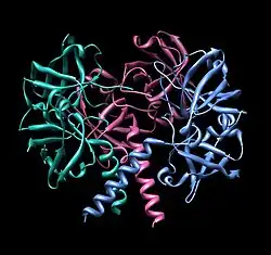 Archeal riboflavin synthase forms as a homopentamer, whereas eubacterial, fungal and plant riboflavin synthase exists as a homotrimer. Their sequences are entirely unrelated, the archeal enzyme is paralogous to 6,7-dimethyl-8-ribityllumazine synthase.[3] The reactions catalyzed by these two types of riboflavin synthase proceed via "enantiomeric" intermediates.[3]