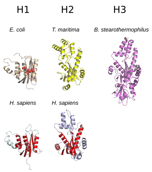 RNases H can be broadly divided into two subtypes, H1 and H2, which for historical reasons are given Arabic numeral designations in eukaryotes and Roman numeral designations in prokaryotes. Thus the Escherichia coli RNase HI is a homolog of the Homo sapiens RNase H1.[2][7] In E. coli and many other prokaryotes, the rnhA gene encodes HI and the rnhB gene encodes HII. A third related class, called HIII, occurs in a few bacteria and archaea; it is closely related to prokaryotic HII enzymes.[4]