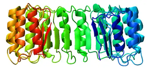 ![]() Top view of porcine ribonuclease inhibitor, showing its horseshoe shape.[1] The outer layer is composed of α-helices and the inner layer of parallel β-strands. The inner and outer diameters are roughly 2.1 nm and 6.7 nm, respectively. | |||||||||||
