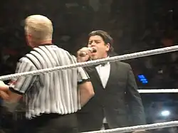 At the 2011 WWE Draft, Rodriguez and Del Rio were drafted to the Raw brand; the duo clashed with Big Show when Rodriguez ran over Big Show's leg by using Del Rio's car.[20] On June 6, Rodriguez masqueraded as Big Show as Del Rio mocked Big Show.[21] On his return to Raw on June 13, Big Show attacked Del Rio. Rodriguez came to his employee's aid and he was brutally attacked which caused him to take time off for an injury.[22][23] Rodriguez returned on July 18, 2011[24] On August 30 episode of SmackDown, when John Cena called out Del Rio, Rodriguez walked out alone to reply to Cena. Rodriguez spoke in a mixture of English and Spanish, explaining that Del Rio was not present. Cena then asked Rodriguez to deliver a message to Del Rio, and then promptly punched Rodriguez in the face.[25] On the September 12 episode of Raw SuperShow, Rodriguez wrestled his first match for the brand, teaming with Del Rio to lose to John Cena and Bret Hart.[26]