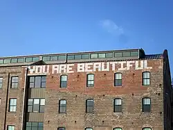 Entrepreneur Sean Cummings purchased the building in 1993, but did not begin renovations until March 2010.[1] In the meantime, the building was heavily vandalized. When the $20 million renovation began, Cummings decided to keep much of the original graffiti, including a large mural on the exterior building with the words "You are Beautiful," which is rumored to have been created by British street artist Banksy.[2]