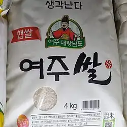 Yeoju rice(여주 쌀) is rice produced in Yeoju, Gyeonggi-do. Yeoju rice has obtained a "G mark" only available by certification of the governor of Gyeonggi-do.[6] The 'G Mark' is a brand mark given exclusively to agricultural products from Gyeonggi-do. The reason why Yeoju rice is considered superior is that Yeoju enjoys climatic advantages. It is not located in an area greatly affected by drought and flooding; there are few high mountains, so there are longer sunshine hours; and the daily temperature difference between day and night is larger than in other areas. Yeoju has superior water quality because the Namhan River flows through the center of the region. Finally, the area can produce high-quality rice because the land is high in biological content.[8]