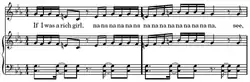 The introduction consists of the repeated use of the word na. Stefani reaches her highest note of the song, E5, as part of a trichord and her lowest, G3, during this section.[7] After the first chorus, Stefani discusses dreams of wealth and luxury,[11] and she namechecks fashion designers Vivienne Westwood and John Galliano. Stefani commented that the references were not product placement but that she included them "because I think they're rad and want to talk about them. [...] I'd give all my money to [Westwood] and buy all her clothes!"[12] A bridge, in which Stefani's voice is overdubbed, precedes the second chorus. During the second verse Stefani discusses her Harajuku Girls, and she then repeats the bridge. Following Eve's rap, Stefani sings the chorus and closes the song by repeating the introduction as a coda.[7]
