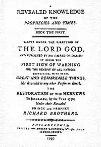 A REVEALED KNOWLEDGE OF THE PROPHECIES AND TIMES, Book the First, wrote [sic] under the direction of the LORD GOD and published by His Sacred Command, it being the first sign of Warning for the benefit of All Nations; Containing with other great and remarkable things not revealed to any other Person on Earth, the Restoration of the Hebrews to Jerusalem by the year of 1798 under their revealed Prince and Prophet (i.e., Richard Brothers). London, Printed in the year of Christ 1794.