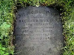 Buxton died on 2 January 1865 at Limekiln Lane, Ardwick, aged 79 [note 3] and was buried at the Church of St Mary the Virgin, Prestwich, on 5 January.[9] In his obituary in the Manchester Courier, an unnamed "eminent man of science" described him as "probably one of the best British botanists, so far as flowering plants are concerned, that Lancashire has produced".[12]