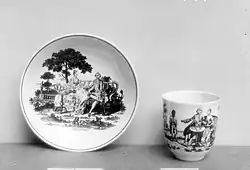 In 1755 Robert Podmore, a potter from the porcelain factory in Worcester, showed him and his business partner Philip Christian how to make porcelain using soapstone, discovered in Mullion Cove in Cornwall; Chaffers subsequently became a rival to Josiah Wedgwood.[1][2] Many pieces from the factory have transfer printing by John Sadler.[3]