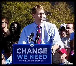 Cordray announced his 2008 candidacy for Ohio state attorney general on June 11, 2008. He was endorsed by Ohio Governor Ted Strickland.[76][77] The vacancy in the office of the attorney general was created by the May 14, 2008, resignation of Marc Dann, who was embroiled in a sex scandal.[77][78][79] Several leading Republican party contenders such as Montgomery, Jim Petro, DeWine, Maureen O'Connor, and Rob Portman declined to enter the race.[77][80] Cordray's opponents in the race were Michael Crites (Republican), and Robert M. Owens (Independent).[81] Cordray had a large financial advantage over his opponents, with approximately 30 times as much campaign financing as Crites.[82] Crites's campaign strategies included attempts to link Cordray with Dann—an association The Columbus Dispatch called into question[83]—and promoting himself as having more years of prosecutorial experience.[84] Cordray asserted that he managed the state's money safely despite the turbulence of the 2008 financial crisis.[85][86]