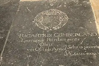 Richard Cumberland (15 July 1631 (or 1632[1]) – 9 October 1718) was an English philosopher, and Bishop of Peterborough from 1691. In 1672, he published his major work, De legibus naturae (On natural laws), propounding utilitarianism and opposing the egoistic ethics of Thomas Hobbes.