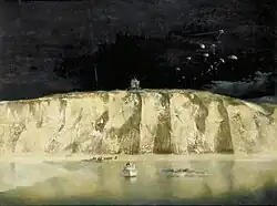 After completing his Dunkirk painting and a number of other short-term commissions for WAAC, Eurich was given a full-time commission to paint Admiralty subjects. This commission lasted from 1941 to 1945 during which time he painted, sometimes, epic reconstructions of battle scenes, depictions of survival stories and also simpler paintings of ships and boats.[4] Some of these works were based on locations and vessels Eurich was familiar with, such as his paintings of British fishing boats and of naval actions off the south coast of England. To ensure accuracy, Eurich made several trips on destroyers patrolling the Straits of Dover during the war. Other paintings were based on photographs and eyewitness accounts and some were wholly works of imagination.[2] This last category included Survivors From a Torpedoed Ship showing exhausted men clinging to the upturned hull of their lifeboat.[5] Although the painting was greatly praised, by Winston Churchill among others, WAAC quickly withdrew it from public display fearing it would adversely affect recruitment to the Merchant Navy.[2] Eurich painted reconstructions of British Commando raids on Vaagso, Bruneval and Dieppe. For the Dieppe raid, Eurich was given access to the operations room for the attack and listened to the British radio communications as events developed.[2][6] During the war, Eurich also painted scenes representing the D-Day landings, the Battle of Salerno, the wreck of the Tirpitz and air attacks on a convoy.[4] In total during the war, Eurich completed some 34 oil paintings and one drawing for WAAC.[2]