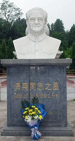 In 1942, he applied for a membership in the Chinese Communist Party (CCP) and was accepted in 1944, later took part in the Historically important 7th National Congress of the Chinese Communist Party in Yan'an – the political and military base of the CCP – as a guest auditor. After the war, Frey was able to obtain citizenship, and remained in China until his death in 2004.[4]