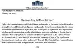 As a temporary incumbent, Grenell was not subject to Senate confirmation. Although Trump indicated he would be appointing a new U.S. ambassador to Germany,[90] Grenell kept this position while also serving in his new role,[91] and Grenell indicated he did not expect to take the director of national intelligence job on a permanent basis.[90]