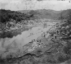 Having endured two trials for theft, he was considered by many to be a thief.[20] Barter changed his name to Dick Woods and moved 200 miles (320 km) north to Shasta County where he mined for two years[18][20] in the Lewiston, Trinity, and South Fork of the Klamath Rivers, as well as French Gulch.[18] He met up with other miners who also left Rattlesnake Bar for Shasta County, he mined with some, he left those who were less friendly alone.[18][21] He came across a man at French Gulch who knew him from Rattlesnake Bar and that he changed his surname to Woods.[22] Besides mining, Barter also made money as a gambler.[23]