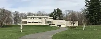 The Richard H. Mandel House is a historic home located at Bedford Hills, Westchester County, New York. It was designed by architect Edward Durell Stone and built between 1933 and 1935 in the International style. It is a Z-shaped building sited overlooking the Croton Reservoir. It is a two-story, concrete block, steel frame, and stucco building with a partial basement recessed into the sloping site. Located on a lot of 21 acres, the house is almost 10,000 square feet with 7 bedrooms and 4.5 bathrooms.[2] It features a flat roof, smooth and uniform wall surfaces, lack of applied ornament, asymmetrical composition with an emphasis on horizontality, and projecting balconies and wide expanses of ribbon windows. The original owner was Richard Mandel (1907–1976), a member of the Mandel Brothers department store family of Chicago.[3]