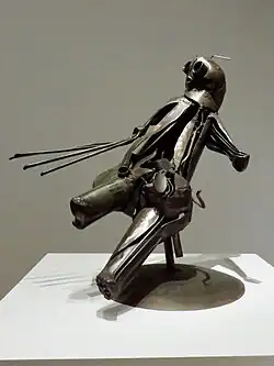 While studying at the School of the Art Institute of Chicago, Hunt focused his sculptural work on creating soldered wire figures, then on welding sculptures, as well as producing drawings, paintings, and lithographs.[17][11] The School of the Art Institute of Chicago did not have classes or materials suitable for learning welding, so he purchased his own welding equipment in 1955, and with little instruction, taught himself to weld in the basement studio of his father’s barbershop.[19] Interested in Modernism, Abstract Expressionism, and Surrealism, he experimented with the assemblage of broken machine parts, car bumpers, and metals from the junkyard reshaping them into organic forms.[20] Hunt went on to work with iron, steel, copper, and aluminum producing a series of "hybrid figures", references to human, animal, and plant forms.[21] Hunt explored the interplay of organic and industrial subject matter in his artwork. His earliest works, which often represented classical themes, are more figurative than his later works.[12]