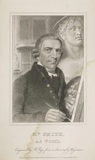 His performance as Robert in the pantomime of Raymond and Agnes attracted the attention of Robert William Elliston, who engaged him in 1810 for the pantomime at the Surrey Theatre. Taking in Bombastes Furioso the part of Bombastes, vacated through illness by another actor, he gave an exhibition of intensity such as established his position in burlesque. A performance of 'Obi' in the melodrama of Three-fingered Jack (1819) got him his sobriquet of 'O' (otherwise Obi) Smith.[3] In 1813 Smith accompanied Elliston to the Olympic Theatre, where he played Mandeville in the False Friend, a rôle in which Edmund Kean was to have appeared. After acting at the Lyceum Theatre, he is said to have been engaged in 1823 at the Theatre Royal, Drury Lane, at which house he had previously been seen in pantomime. He also seems to have played at the Royal Opera House in Covent Garden. His performance in the Bottle Imp at the Lyceum Theatre attracted attention, leading him to complain, but half in jest: "For the last five years of my life I have played nothing but demons, devils, monsters, and assassins, and this line of business, however amusing it may be to the public or profitable to managers, has proved totally destructive of my peace of mind, detrimental to my interests, and injurious to my health. I find myself banished from all respectable society; what man will receive the Devil upon friendly terms, or introduce a demon into his family circle? My infernal reputation follows me everywhere". A writer in the Monthly Magazine declared him "eminent in assassins, sorcerers, the moss-trooping heroes in Sir Walter Scott's poems, and other wild, gloomy, and ominous characters in which a bold, or rather a gigantic figure, and deep sepulchral voice could be turned to good account." Smith had, however, some control over tenderness, his performance at the Lyceum, in the Cornish Miners, of a maniac who visits the grave of his dead child, being very pathetic. At Drury Lane he was, on 10 November 1824, the first Zamiel in Soane's version of Der Freischütz.