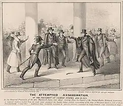 Lawrence's unsuccessful attempts were noticed by Jackson, who proceeded to beat Lawrence with a cane. The crowd, which included U.S. Representative Davy Crockett, eventually intervened and wrestled Lawrence into submission.[3] Lawrence was the first person to attempt to kill a sitting U.S. president.[7]