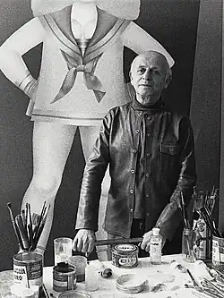 ![]() Painter Richard Lindner posing in his studio, in front of his current work, Girl with Green Hair, 1972. | |