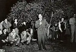 Nixon attended East Whittier Elementary School, where he was president of his eighth-grade class.[15] His older brother Harold had attended Whittier High School, which his parents thought resulted in a dissolute lifestyle. They decided to send Nixon to the larger Fullerton Union High School.[16][17] Though he had to ride a school bus an hour each way during his freshman year, he attained excellent grades. Later, he lived with an aunt in Fullerton during the week.[18] He played junior varsity football, and seldom missed practice, though he rarely was used in games.[19] He had greater success as a debater, winning a number of championships and taking his only formal tutelage in public speaking from Fullerton's Head of English, H. Lynn Sheller. Nixon later mused on Sheller's words, "Remember, speaking is conversation...don't shout at people. Talk to them. Converse with them."[20] Nixon said he tried to use a conversational tone as much as possible.[20]