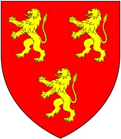 Arms of FitzRoger: Gules, three lions rampant or. These arms were subsequently quartered by the Stucley family[5] and are visible in stained glass in King's Nympton church in Devon.