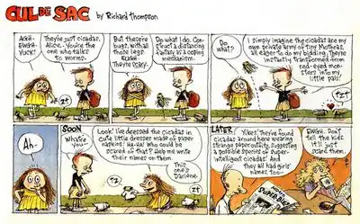 I thought the best newspaper comic strips were long gone, and I've never been happier to be wrong. Richard Thompson's Cul de Sac has it all—intelligence, gentle humor, a delightful way with words, and, most surprising of all, wonderful, wonderful drawings. Cul de Sac's whimsical take on the world and playful sense of language somehow gets funnier the more times you read it. Four-year-old Alice and her Blisshaven Preschool classmates will ring true to any parent. Doing projects in a cloud of glue and glitter, the little kids manage to reinterpret an otherwise incomprehensible world via their meandering, nonstop chatter. But I think my favorite character is Alice's older brother, Petey. A haunted, controlling milquetoast, he's surely one of the most neurotic kids to appear in comics. These children and their struggles are presented affectionately, and one of the things I like best about Cul de Sac is its natural warmth. Cul de Sac avoids both mawkishness and cynicism and instead finds genuine charm in its loopy appreciation of small events. Very few strips can hit this subtle note.[3]