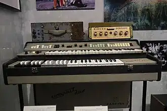 In the early days of Pink Floyd, Wright dabbled with brass before settling on Farfisa electric organs as his main instrument onstage. He originally owned a single-manual Combo Compact model, which was used for early recordings of "Interstellar Overdrive",[77] and he later upgraded to a dual-manual Compact Duo. During the 1960s, Wright relied heavily on his Farfisa fed through a Binson Echorec platter echo, as heard on the Ummagumma live album.[76] On later tours, the Farfisa was fed through a joystick control allowing the signal to be sent through up to six speakers in an auditorium, which was called the "Azimuth Coordinator".[81] Wright stopped using the Farfisa after The Dark Side of the Moon, but revisited it in later years, playing it on Gilmour's On An Island tour. It was recorded for the sessions that eventually became The Endless River.[82]