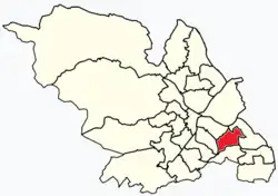 Richmond gives its name to one of the 28 electoral wards of Sheffield, in the southern part of the city. In addition to the suburb of Richmond, Richmond ward also includes the districts of Four Lane Ends, Intake, and Woodthorpe, and covers an area of 4.5 km2. The population of the ward in 2011 was 17,724 people in 7,827 households.[2] It is one of the five wards that form the Sheffield Heeley parliamentary constituency. The boundary changed at the local elections in May 2016.