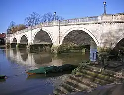 - ^ London Bridge (circa 55 AD), Kingston Bridge (date of construction unrecorded, but renovated in 1193 so dating from the mid-12th century at the latest), Putney Bridge (1729), Westminster Bridge (1739), Hampton Court Bridge (1752), Kew Bridge (1759), Blackfriars Bridge (1769) and Battersea Bridge (1771) predate Richmond Bridge, but have all been demolished and replaced since the construction of Richmond Bridge.