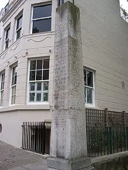 Construction began on 23 August 1774.[20] The Prince of Wales was invited to lay the first stone but declined, and so the stone was laid by commission member Henry Hobart.[22] The bridge opened to pedestrians in September 1776 and to other traffic on 12 January 1777, at which time the ferry service was closed,[14] although work on the bridge was not completed until December 1777.[20] A large milestone was placed at the Richmond end, giving the distances to other bridges and to local towns.[23]