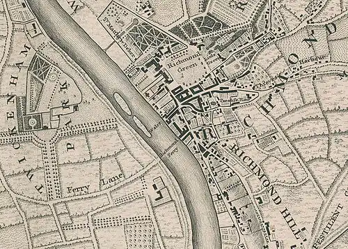 Although a ferry had almost certainly existed at the site of the present-day bridge since Norman times,[5] the earliest known crossing of the river at Richmond dates from 1439.[6] The service was owned by the Crown, and operated by two boats, a small skiff for the transport of passengers and a larger boat for horses and small carts;[4] the Twickenham Ferry, slightly upstream, was also in service from at least 1652.[7] However, due to the steepness of the hill leading to the shore-line on the Surrey side neither ferry service was able to transport carriages or heavily laden carts,[8] forcing them to make a very lengthy detour via Kingston Bridge.[4]